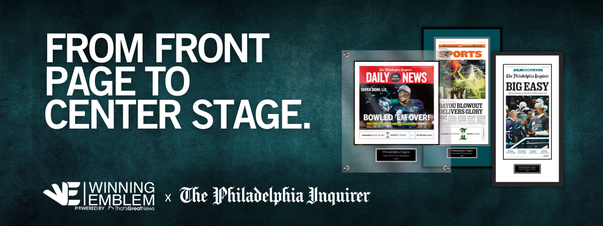 WinningEmblem powered by That's Great News is proud to offer official, high-quality wall art that showcases iconic moments from The Philadelphia Inquirer. Each piece captures the essence of history and celebrates the stories that shaped our community.